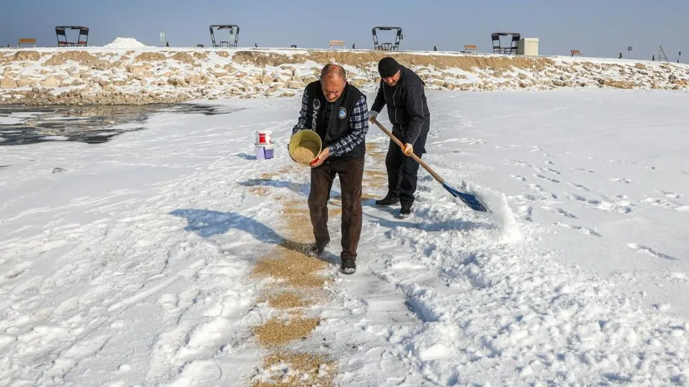 Bu kapsamda Van Gölü Sahil Yolu ve Van Kalesi çevresinde kuşların yoğun olarak bulunduğunu göz önünde bulunduran ekipler, kuşlar için sahil kenarına ve Van Kalesi çevresindeki sazlıklara buğday bıraktı.
