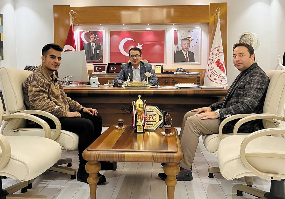 Vanlı sporcu Can Muhammed Saki, şampiyona öncesi kendilerine destek veren İpekyolu Kaymakamı Abdulkadir Umut Kasman'ı makamında ziyaret ederek, elde ettiği altın kemer ve kupayı takdim etti.